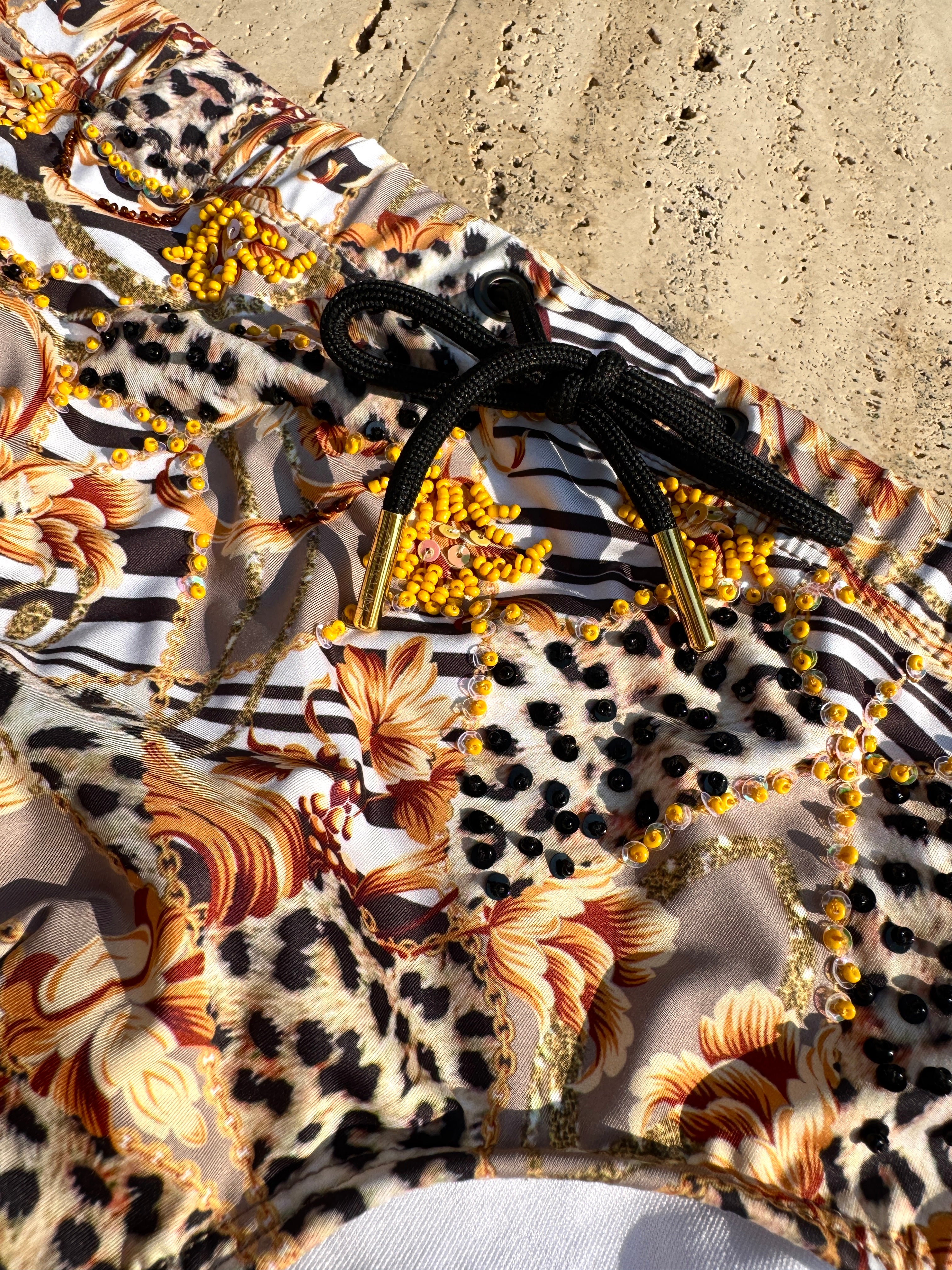 A fierce mash-up of leopard print, baroque gold chains, florals, zebra stripes, and hand beading. Nakupenda Briefs brings the heat. Every element is enhanced with hand-applied beadwork for that extra dose of drama and shine.